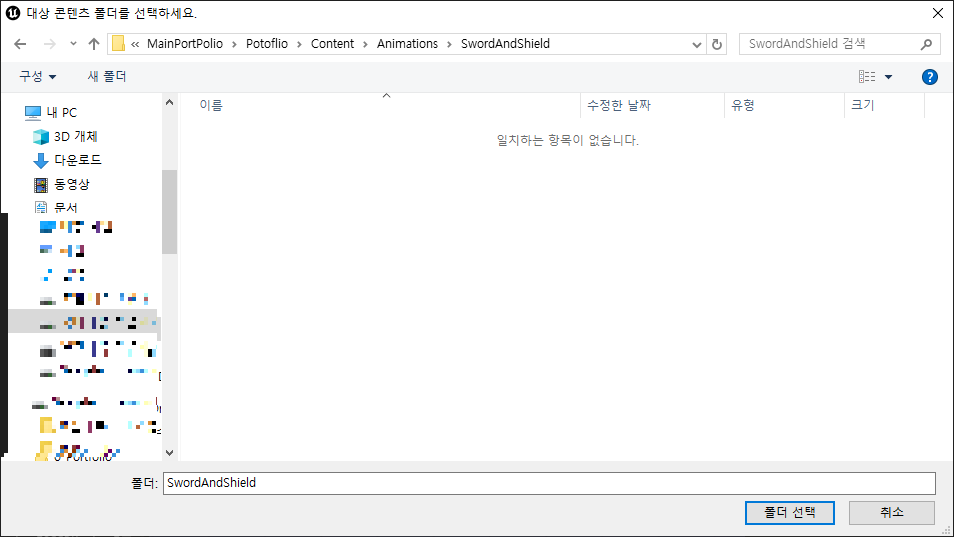 [Content] 파일을 지정하여, [폴더 선택] 을 해주면 다음처럼 에디터에서 원하는 프로젝트를 진행중인 언리얼엔진 에디터 파일로 넘어가는 것을 볼 수 있었다.