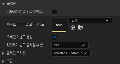 | Capsule | 사람형 캐릭터 충돌 기본값 (가장 자연스럽게 걷고 부딪힘 처리됨) |