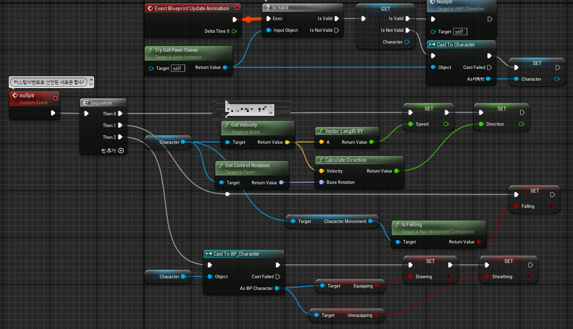 기존의 애니메이션은 유지하되 [Cast to BP_Character]로 호출되는 노드는 연결이 불가한 점을 예상 할 수 있다.