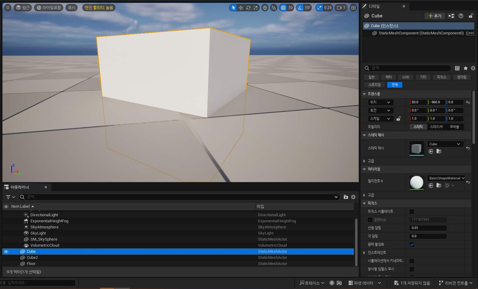 월드에 생성된 큐브 오브젝트를 확인 할 수 있다.