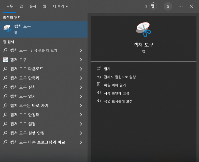 윈도우 검색창에 '캡처 도구'를 입력하여 실행하는 모습입니다. 간단한 검색으로도 도구를 쉽게 찾을 수 있어 접근성이 뛰어납니다.