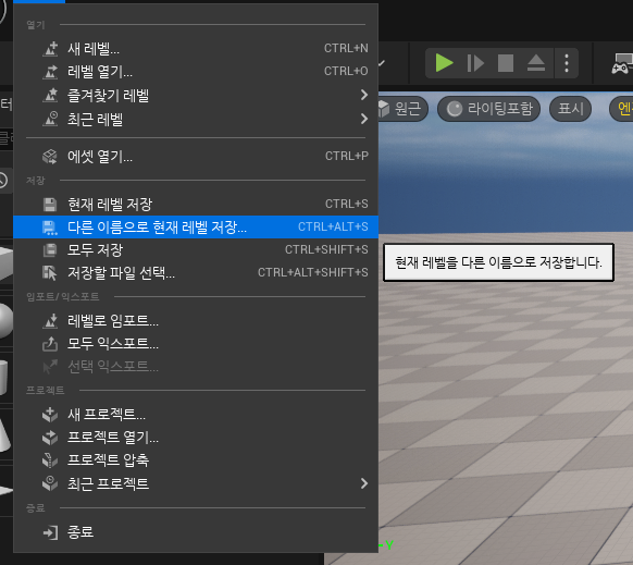 생성된 레벨은 - 파일 - 다른이름으로 현재 레벨 저장하면 된다.