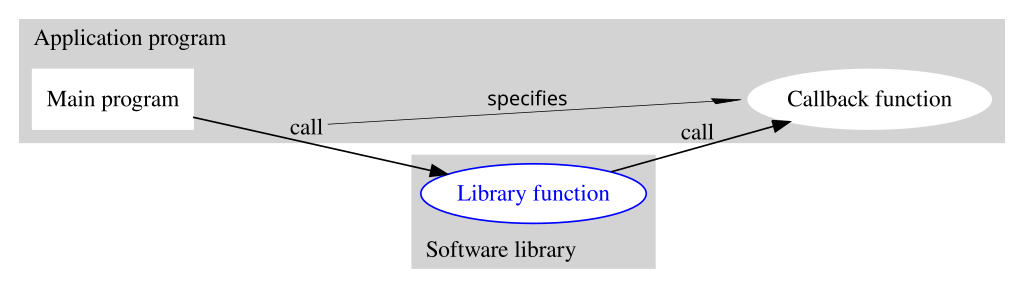 고 한다. 자료 구조를 도식화 하여보면 다음과 같은 특성을 갖고 있는데, 콜백을 넘겨받는 코드는 이 콜백의 필요에 따라 즉시 실행이 가능하기도, 혹은 나중에 실행 할 수도 있다. 일반적으로 콜백수신 코드로 콜백 코드(함수)를 전달할 때는 콜백 함수의 포인터 (핸들), 서브루틴 또는 람다함수의 형태로 넘겨주는데, 이러한 특성은 코드 재사용시 유용한 특성을 갖는다고 한다.