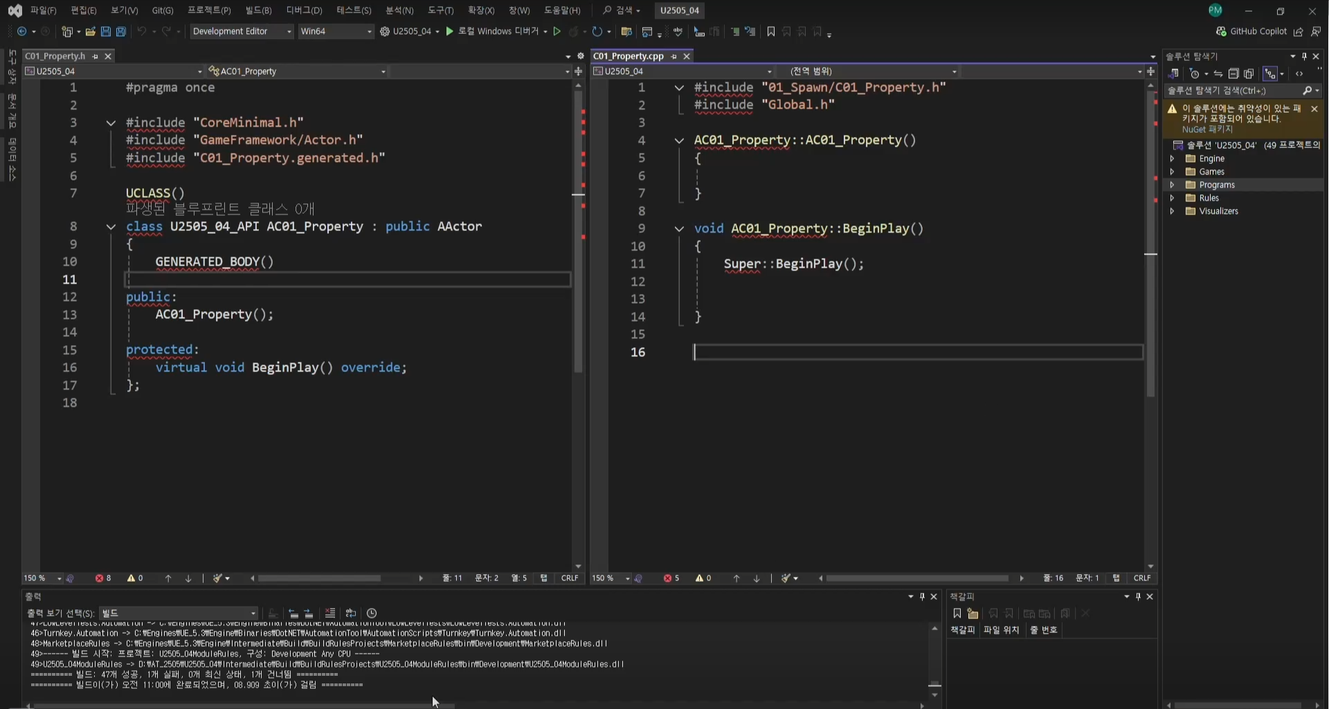 최초 빌드간의 에러들을 잡은 뒤 생성하는 과정이다. AActor 빌드CS를 기준으로 C++를 생성해야하기 때문에